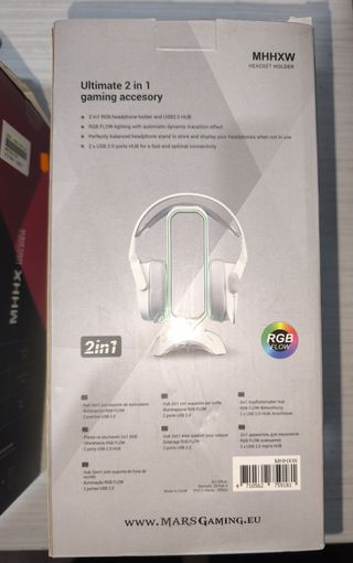 Soporte para auriculares Mars Gaming MHHX, con iluminación RGB Flow. Tiene un diseño elegante y moderno disponible en color blanco y otro en negro. Incluye dos puertos USB 2.0. Es un soporte 2 en 1 para auriculares y hub USB. tiene gama de colores RGB. Totalmente nuevos a estrenar