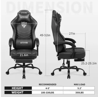 Silla de gaming SITMOD en color negro, con un diseño ergonómico y reposapiés. - Ancho del asiento: 21.6in - Altura total: 49-52in - Profundidad del asiento: 23in - Ancho total: 27in - Altura del asiento: 25.2-29.1in - Carga máxima: 350LBS - Recomendada para alturas de 4'-5' - Peso recomendado: 100-330LBS