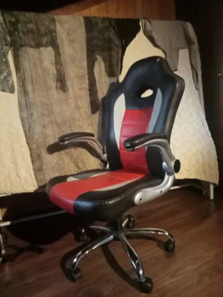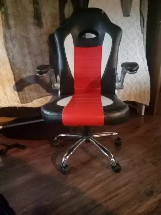 Silla de ordenador con diseño deportivo, ideal para largas sesiones de juego o trabajo. Su estructura ergonómica ofrece comodidad. - Tapicería en cuero sintético negro y rojo. - Base con ruedas para fácil movilidad. - Reposabrazos acolchados.