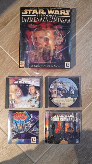 Vendo lote de juegos de PC de la saga Star Wars compuesto de: - Star Wars: Episodio I - La Amenaza Fantasma caja grande Big box (caja con algún desperfecto). Incluye tarjeta de registro. - Star Wars: Episodio I - DVD Collection - Star Wars: Rebel Assault - Star Wars: Force Commander (la caja está muy rota) - Making Magic El precio es por el lote completo. Las fotos son parte de la descripción.