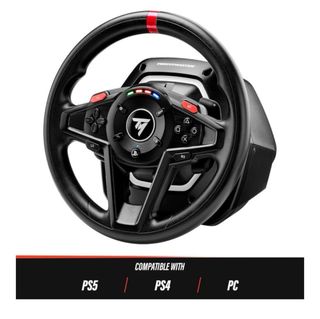 Volante de gaming Thrustmaster con base de pedales. - Diseño deportivo con detalles en rojo. - Botones y palancas integrados en el volante. - Base de pedales con superficie texturizada. Es la version de xbox