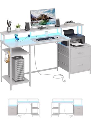 Escritorio gaming marca Kimenich. El color es madera como se ve en la ultima foto, pero en esa el modelo no es el mismo. Yo lo uso y me encanta, lo vendo nuevo en la caja porque el proveedor me mandó 2 por error. Vale 150€ online. Escritorio moderno con diseño para gaming. Cuenta con una estructura robusta y un acabado elegante. - Superficie amplia para equipo. - Estante superior para monitor y accesorios. - Cajonera lateral integrada. - Compartimento para torre de PC. - Soporte para auriculares.
