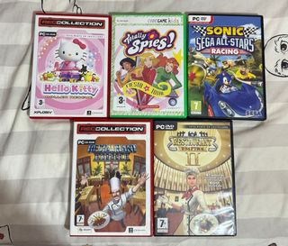 Se venden cinco juegos para ordenador en buen estado. - Incluye Hello Kitty Roller Rescue, Totally Spies Fiesta Total, Sonic Sega All-Stars Racing, Restaurant Empire y Restaurant Empire II. - Los juegos están en sus cajas originales y contienen el disco. Vendo los 5 juegos por 10 euros.
