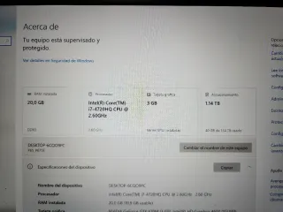 Portátil gaming con procesador Intel Core i7 y 20gb de ram - Procesador: Intel(R) Core(TM) i7-4720HQ CPU @ 2.60GHz - RAM: 20,0 GB (19,9 GB usable) - Tarjeta gráfica: NVIDIA GeForce GTX 970M (3 GB) - Almacenamiento: 238 GB SSD DREVO X1 PRO SSD, 932 GB HDD TOSHIBA MQ01ABD100 - Sistema operativo: 64 bits Tiene para ponerle 2 ssd m2 mas, Funciona bastante bien la pantalla es 2k 2880 x 1720, sin devolución ya que especifico defectos en la parte derecha del chasis de la pantalla.y del tracalada tiene el botón derecho suelto, de ahí el precio.