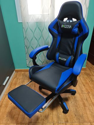 Silla de gaming con un diseño ergonómico y moderno, ideal para largas sesiones. - Tapicería en cuero sintético negro y detalles en azul. - Reposacabezas y soporte lumbar incluidos. - Reposapiés extraíble. -Respaldar inclinable Como nueva ningún arañazo ni mancha, muy poco uso