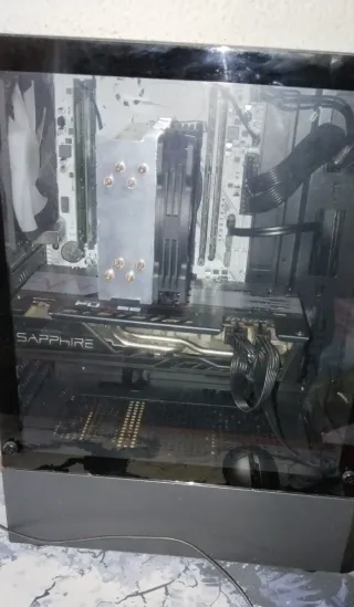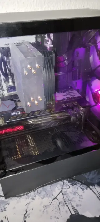 Componentes de PC para gaming. - Tarjeta gráfica Sapphire. - Sistema de refrigeración de CPU. - Iluminación LED púrpura.