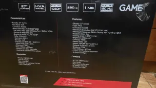 Monitor curvo de 27 pulgadas con panel HVA y resolución Full HD. - Curvatura R1500. - Frecuencia máxima de 280Hz (Display Port) / 240Hz (HDMI). - Tiempo de respuesta de 1ms. - Brillo de 250cd/m2. - Contraste 4000:1. - Formato 16:9. - Entradas: 2xHDMI 2.0, 2xDP 1.2. - Salida: Audio Jack 3.5mm. - Altavoces: 2x3W. - Compatible con FreeSync y G-Sync. - Iluminación trasera en tres colores. - Soporte VESA 100mm x 100mm. - Incluye: Monitor, guía de usuario, base, tornillos, adaptador de corriente 12V/4A y cable Display Port.