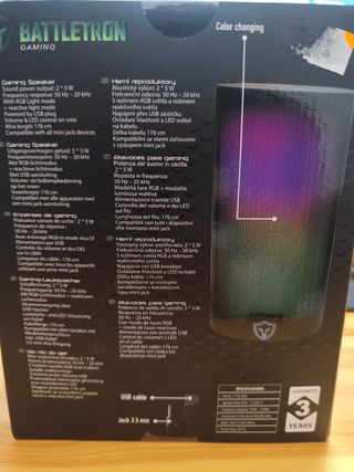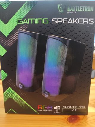 Altavoces para gaming de la marca Battletron con iluminación RGB. - Diseño moderno en color negro y multicolor. - Iluminación LED RGB que cambia de color. - Potencia de 2x 5 Watt. - Adecuados para PC.