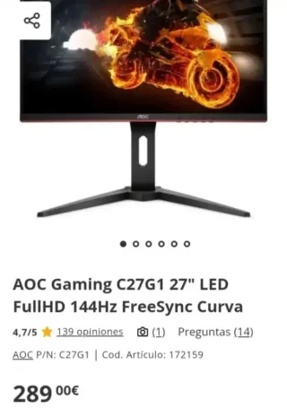 ¡Tiene una pequeña ralla en la pantalla! AOC Gaming C27G1 27" LED FullHD 144Hz FreeSync Curva ResoluciónFHD 1080p Relación de aspecto16:9 Descripción de la superficie de la pantallaCurvo Relación de contraste de la imagen80000000:1 Monitor gaming curvo AOC C27G1 de 24'' FullHD (1920x1080) que permite disfrutar de una calidad de imagen inmaculada con un tiempo de respuesta de 1 ms para jugar a juegos que demanden una óptima resolución Diseño de bisel estrecho sin marco: minimiza las distracciones y crea configuraciones de varios paneles prácticamente ininterrumpidas Freesync para disfrutar toda la acción sin parpadeos y tecnología