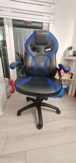 Silla de estilo gaming con un diseño ergonómico y deportivo. - Tapicería en polipiel negra con detalles en azul. - Respaldo alto con soporte lumbar. - Reposabrazos acolchados. - Ajuste de altura y ruedas. Practicamente nueva, poco uso.