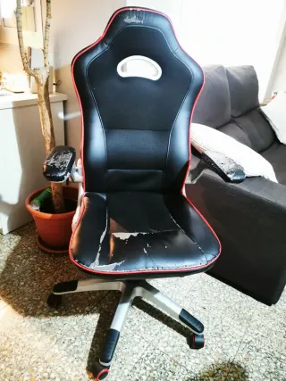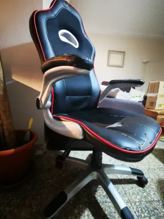 Silla de estilo gaming en color negro con detalles en rojo. Presenta un diseño ergonómico. - Tapicería de polipiel algo gastada (de ahi su precio) - Base con ruedas. - Reposabrazos que se pueden levantar