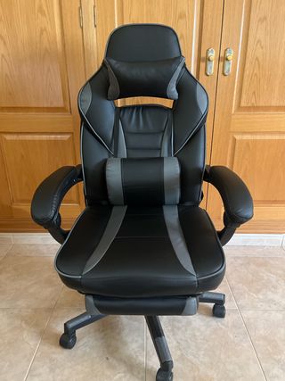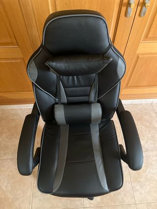 Silla gaming ergonómica en perfecto estado. Diseñada para ofrecer comodidad durante largas sesiones. - Tapicería en cuero sintético negro y gris. - Respaldo alto con soporte lumbar. - Reposacabezas y cojín lumbar incluidos. - Base giratoria con ruedas.