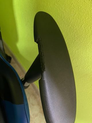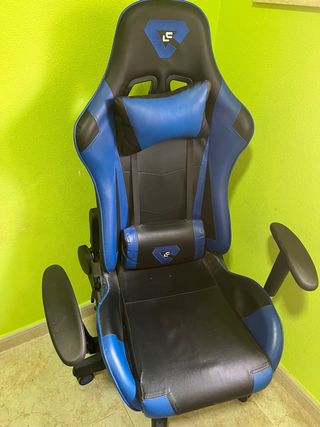 Silla ergonómica de estilo gamer, diseñada para largas sesiones. - Tapicería en polipiel azul y negro. - Respaldo alto con soporte lumbar. - Cojines para cabeza y zona lumbar. - Reposabrazos ajustables. - Base con ruedas para fácil movilidad.