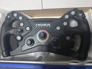 Volante Moza KS V2, abierto para probar su funcionamiento. Diseño inspirado en la competición. - Acabado en fibra de carbono. - Botones personalizables. - Dial selector MAP. - Botones BB, TC y ABS.