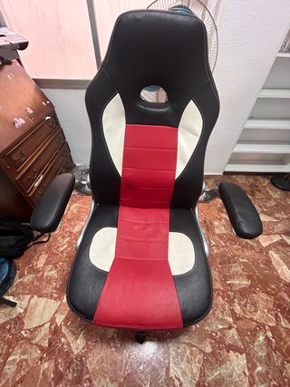Silla de estilo gaming con un diseño ergonómico y moderno. - Tapicería en cuero sintético negro, blanco y rojo. - Respaldo alto con soporte lumbar. - Reposabrazos acolchados. En perfecto estado de salud. Solo que de vez en cuando se baja poco a poco sola no se si sera cuestion de apretar mas el muelle etc. Entrega en mano en valencia