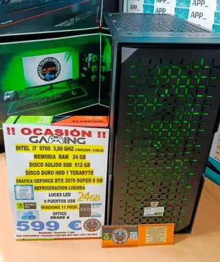 Ordenador de sobremesa para gaming, trabajo y estudio. Con un diseño moderno y luces LED. - Procesador Intel i7 9700 a 3,00 GHz (4 núcleos, 8 hilos). - 24 GB de memoria RAM. - Disco SSD de 512 GB. - Disco duro HDD de 1 TB. - Tarjeta gráfica GeForce RTX 2070 Super de 8 GB. - Refrigeración líquida. - 9 puertos USB. - Windows 11 Pro. - Incluye Office Grado A. - Revisado y con 1 año de garantía. LO MEJOR AL MEJOR PRECIO💻 REALIZAMOS ENVÍOS A TRAVÉS MENSAJERÍA DE EMPRESA📦 🔝APP-INFORMATICA-DELICIAS-VALLADOLID🔝 C/Carmelo,4-bis ☎️983 477 364📱632 185 890