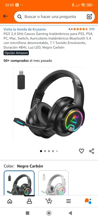 Cascos gaming inalámbricos en color Negro Carbón. Ideales para PS5, PS4, PC, Mac y Switch. NUNCA USADOS. - Conexión 2,4 GHz y Bluetooth 5.4. - Micrófono desmontable. - Sonido envolvente 7.1. - Duración de batería de 48 horas. - Luz LED.