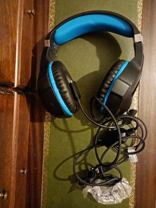 Auriculares para gaming con un diseño moderno en negro y detalles en azul. - Diadema acolchada para mayor comodidad. - Almohadillas suaves para los oídos. - Cable conector incluido. - Micrófono COMO NUEVO, POCO USO, A ESTRENAR... ENTREGA EN MANO O ENVÍO POR WALLAPOP O VINTED