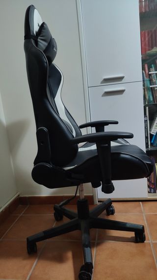 Silla de gaming con un diseño ergonómico y deportivo, ideal para largas sesiones. - Tapicería en polipiel negra y blanca. - Respaldo alto con soportes lumbares y cervicales. - Reposabrazos acolchados. - Base de 5 radios con ruedas para fácil movilidad.