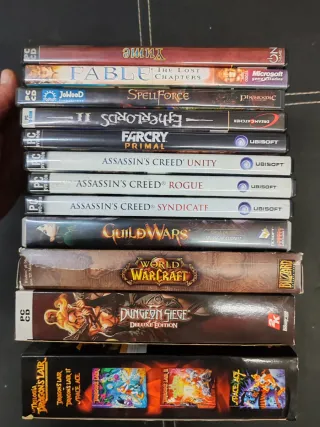 Lote de 38 videojuegos para PC, ideal para coleccionistas y aficionados.Lote 170€, por separado escucho ofertas recogida en mano, se realizan envíos del lote 9€ y el pago por bizum o transferencia - Incluye títulos como Skyrim, Far Cry, Assassin's Creed, World of Warcraft, y más. - las carátulas están y manuales estan en buen estado - Varios juegos de diferentes géneros de aventura, rol y acción.