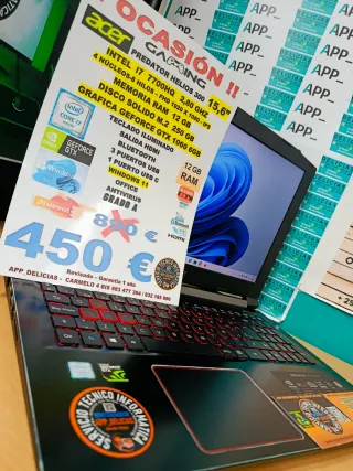 Portátil gaming Acer Predator Helios 300 en perfecto estado, ideal para juegos, trabajo y estudio. - Procesador Intel i7 7700HQ 2.80 GHz - Pantalla FHD 1920 x 1080 IPS de 15,6 - 12 GB de RAM - Disco sólido M.2 de 250 GB - Gráfica NVIDIA GeForce GTX 1060 de 6 GB - Teclado retroiluminado - Salida HDMI - Bluetooth - 3 Puertos USB - 1 Puerto USB C - Windows 11 - Office - Antivirus - Grado A 🎄🎅ESTÁS NAVIDADES REGALA TECNOLOGÍA🎄🎅 En App-DELICIAS encontrarás lo que buscas al mejor precio🎁REALIZAMOS ENVÍOS A TRAVÉS MENSAJERÍA DE EMPRESA📦 🔝APP-INFORMATICA-DELICIAS-VALLADOLID🔝 C/Carmelo,4-bis ☎️983 477 364📱632 185 890