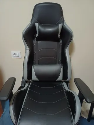 Silla de oficina o gaming en color negro y gris, con un diseño ergonómico y regulable. - Tapicería de cuero sintético. - Cojines para cabeza y lumbar. - Base con ruedas.