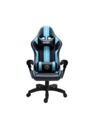 Silla de estilo gaming con diseño inspirado en la NASA. - Asiento y respaldo en negro con detalles en azul. - Bandas verticales con texto SPACE RESEARCH. - Logotipo de la NASA en el respaldo. - Cojines lumbar y cervical incluidos. - Base con ruedas para fácil movilidad.