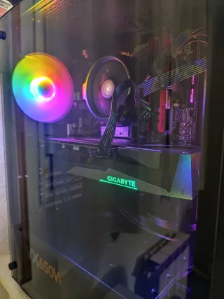 Ordenador gaming con iluminación RGB. - Ventiladores frontales con iluminación.Se da con dos pantallas una 2k de 180hz 27 pulgadas y la otra hull hd 1080 de 165 hz de 23 pulgadas - Tarjeta gráfica 4070 ti super. - 32 gb de ram. - 1tb ssd. - Placa madre z790 aorus elite ddr4. - Procesador i714700f. - Refrigeración líquida.