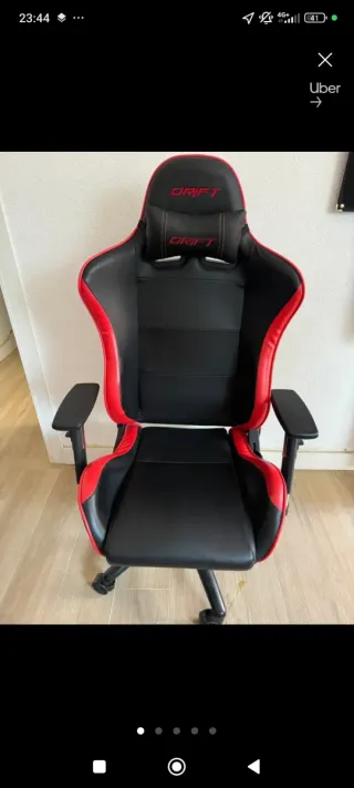 Silla de estilo deportivo para gaming, con un diseño ergonómico y acolchado. - Tapicería en polipiel negra con detalles en rojo. - Respaldo reclinable. - Reposabrazos acolchados. - Base con ruedas para fácil movilidad.