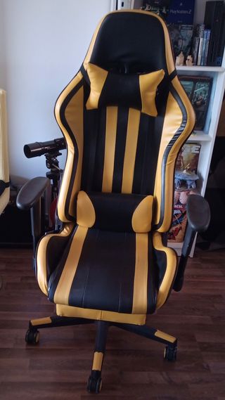 Silla de estilo gaming con un diseño ergonómico y deportivo. Combina colores negro y amarillo para un look llamativo. - Respaldo alto con soporte lumbar y cervical. - Reposapiés extraíble. - Base con ruedas para fácil movilidad. - Silla y brazos ajustables en altura. Pongo marca Amazon porque es donde la compré en su día, pero no pone ninguna marca en la silla.