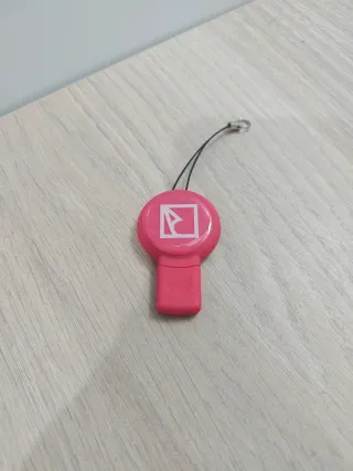 Pendrive de color rojo con un diseño moderno y un pequeño colgante. - Diseño circular en la parte superior. - Colgante con cordón negro.