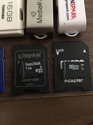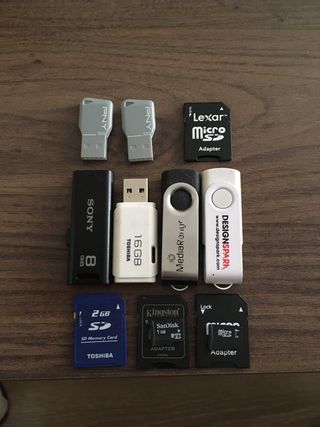 Conjunto variado de dispositivos de almacenamiento. total de gigas 128 y 5 de tarjetas sd el precio es por todo - Dos pendrives PNY de 32GB. - Un pendrive Sony de 8GB. - Un pendrive Toshiba de 16GB. - Un pendrive MediaRange. - Un pendrive DesignSpark. - Una tarjeta Lexar Micro SD. - Una tarjeta Toshiba SD de 2GB. - Un adaptador Kingston con tarjeta SanDisk de 1GB. - Un adaptador con tarjeta Micro SD.