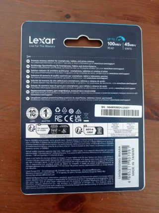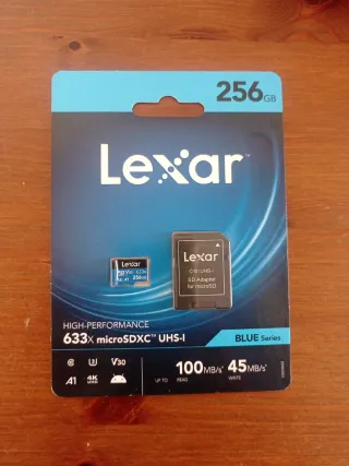 Tarjeta Micro SD Lexar de 256 GB con adaptador SD incluido. - Capacidad de almacenamiento: 256 GB. - Clase de velocidad: V30, U3, A1. - Velocidad de lectura: 633x. - Incluye adaptador SD. Precintado