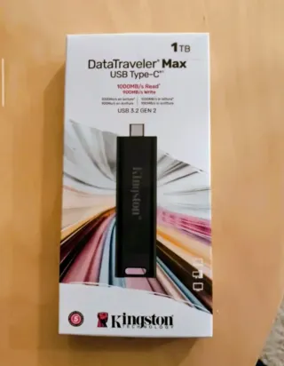 Pendrive Kingston DataTraveler Max de 1TB con conexión USB Type-C. Modelo; Kingston DataTraveler Max Capacidad: 1TB Interfaz: USB 3.2 Gen 2 Velocidad de lectura: 1000MB/s Velocidad de escritura: 900MB/s ATENCIÓN: No tiene conexión USB-A ni incluye adaptador USB-C a USB-A Nuevo, sin abrir