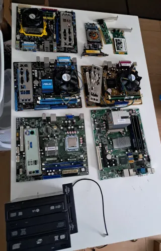 Escucho ofertas de venta o cambio por algo que me interese. Lote de componentes informáticos, incluyendo varias placas base y unidades ópticas. - Placas base de diferentes modelos y marcas. - Unidades ópticas (CD/DVD) apiladas. - procesadores y ram incluidas en todas las placas, ventiladores cpu incluidos. - Tarjeta gráfica de 1gb - Tarjetas de red....