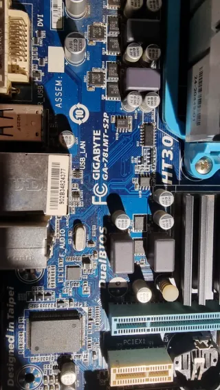 ✔ Marca: Gigabyte Procesador AMD Athlon 64x2 ✔ Socket del procesador: AM2 / AM2+ / AM3 El disipador de AMD y el tipo de retención coinciden con estas generaciones. ✔ Chipset: NVIDIA nForce o AMD/ATI Gigabyte usaba este estilo de disipador en placas de 2007–2010. ✔ Ranuras de RAM: 4 slots DDR2 Esto confirma que es una placa para procesadores AMD antiguos. ✔ Conectividad: VGA integrada USB Ethernet Audio Puerto paralelo (muy retro) SATA (naranja) PCI y PCI‐Express
