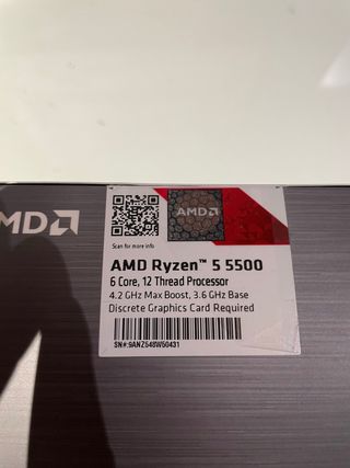 Procesador AMD Ryzen 5 5500. Solo se ha usado para probar una prueba cruzada con una placa base - 6 núcleos, 12 hilos. - Velocidad Max Boost de 4.2 GHz. - Velocidad Base de 3.6 GHz. - Requiere tarjeta gráfica discreta. - Número de serie: 9ANZ548W50431.