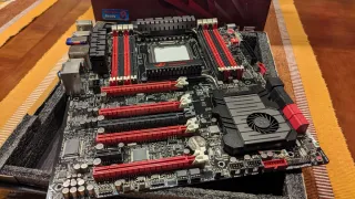 La compré de segunda mano para reparar. He tenido que cambiar el PCH (resultado en la última foto) y reprogramar la BIOS. Funciona todo perfectamente y está bastante bien conservada. Viene en su caja pero no tiene IO SHIELD y la bandeja de cartón no es la original. Para trato en mano doy dos semanas de prueba.