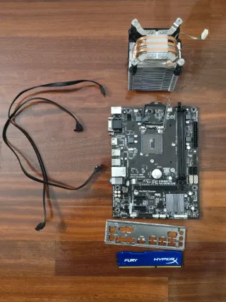 Conjunto de componentes para PC, incluyendo una placa base Gigabyte GA-H81M-S2H. - Placa base Gigabyte GA-H81M-S2H. - Disipador/ ventilador de calor para CPU. (El ventilador hace algo de ruido) - Módulo de memoria RAM HyperX FURY de 8Gb - Chapa trasera para la placa base. - 2 Cables de conexión.