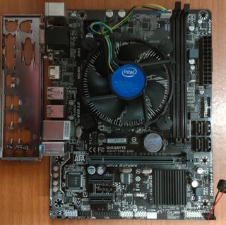 Pack de placa+procesador+disipador+I/O Shield, en perfecto estado de funcionamiento, ideal para montar un PC de oficina, multimedia o un NAS de bajo consumo. Muy cuidada. Se incluye: Placa Gigabyte GA-H110M-S2H (Socket LGA1151). Formato Micro-ATX. Procesador Intel Pentium Gold G4400 (3.30 GHz). Rendimiento eficiente para tareas diarias. Chapa trasera (I/O Shield): Original incluida (difícil de encontrar suelta). Salidas de vídeo: HDMI, DVI-D y VGA (ideal si no quieres usar gráfica dedicada). Soporta memoria RAM DDR4. Puertos USB 3.0 y audio de alta calidad. FUNCIONANDO 100%. Bios actualizada a última versión.