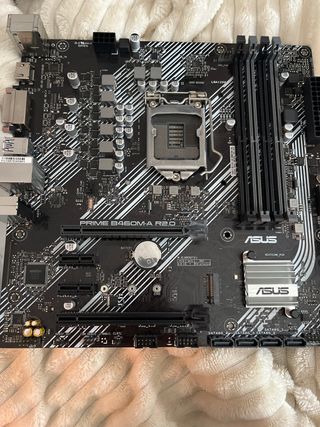 Placa base ASUS PRIME H410M-D. - Socket LGA1200. - Soporta procesadores Intel Core de 10ª generación. - Formato Micro-ATX. - Ranuras de memoria DDR4. - Puertos SATA 6Gb/s. - Procesador Intel Core i5 10400 - Fuente Alimentación Sin mas accesorios Solo placa base , Procesador , fuente alimentación y la chapa trasera. Conjunto comprobado y en funcionamiento. Vendo por wallapop Sin garantía sin devoluciones gracias