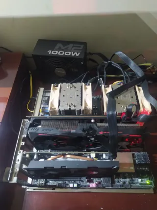 Lote de componentes para ordenador. Placas bases, memorias, procesadores, ventiladores, fuente de alimentación.