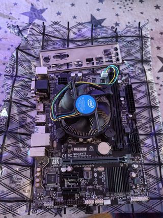 Procesador Intel i5 6400 + Disipador Intel + Placa base Gigabyte GA-H110M-S2H. Muy cuidado todo. Pasta termica y pila de bios CR 2032 (Duracell) cambiadas hace poco. Incluye la tapa metálica trasera. MicroATX. - Soporta memoria DDR4. - Conexiones HDMI, DVI y USB 3.0. - Ranuras PCI Express.