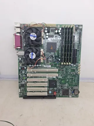 Placa base para ordenador antiguo Supermicro 370DLE. No sé si funciona se vende tal como se ve en las fotos con memoria RAM con procesadores placa muy rara en la última foto se ve lo que vale no se acepta devoluciones - Formato ATX. - Soporta procesadores Intel Pentium III. - Múltiples ranuras de expansión PCI y AGP.