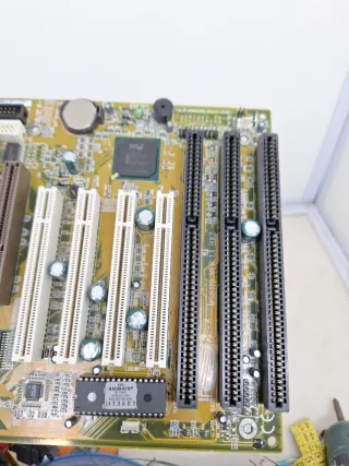 Se vende placa base de ordenador antiguo no sé si funciona se vende tal como se ve en las fotos se ve algunos alambres sueltos no se acepta devoluciones por ser antigua B-1