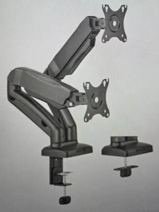 Soporte para dos pantallas con brazos articulados. Permite ajustar la posición de tus monitores. Marca Aisens Soporte de Mesa Pro Giratorio e Inclinable para Monitor/TV 9Kg de 17" a 32" Negro. - Base con pinza para fijar al escritorio. - Brazos giratorios e inclinables. - Placas VESA para montaje de pantallas.