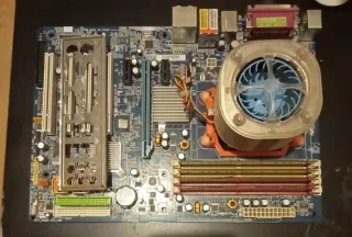 Placa base en buenas condiciones, funciona correctamente. Sin condensadores dañados a simple vista ni corrosión. El ventilador del disipador hace un poco de ruido pero nada grave.