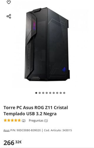 Vendo mi caja Asus Rog Z11, Como nueva. la vendo por que he cambiado de gabinete y tengo una placa ATX y no es compativle con esta caja. Tipo: Mini Torre Material: Acrilonitrilo butadieno estireno (ABS), Aluminio, Acero, Cristal templado Color del producto: Negro Formas de factor de placa base soportadas: Mini-DTX, Mini-ITX Número de puertos 3.5": 1 Número de bahías 2.5": 4 Altura máxima del disipador de CPU: 130 mm Longitud máxima tarjeta gráfica: 320 mm Espacio máximo para la gestión de cables: 40 mm