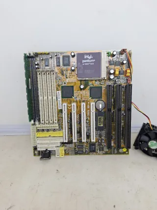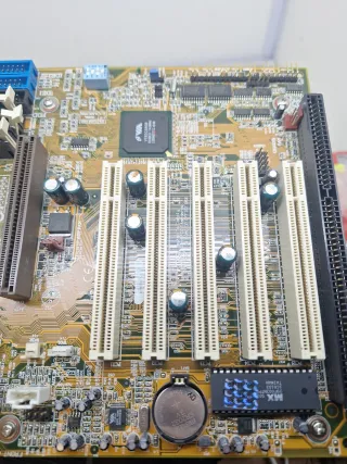 Se vende placa base de ordenador antiguo no sé si funciona se vende tal como se ve en las fotos se ve algunos alambres sueltos no se acepta devoluciones por ser antigua B-1