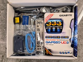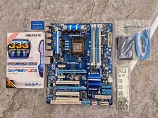 Placa base de la marca Gigabyte, modelo GA-P55A-UD3 para socket LGA1156 con 2 USB 3.0, la placa se vende en su caja con todos sus accesorios originales, incluida la placa trasera, tal y como se puede ver en las fotos, además adjunto un procesador Intel Xeon X3450, similar al i7 860. Ambos componentes están en perfecto estado de funcionamiento, hago envíos. - Incluye manual de usuario. - Cables SATA. - Chapa trasera I/O. - Procesador Intel Xeon X3450.